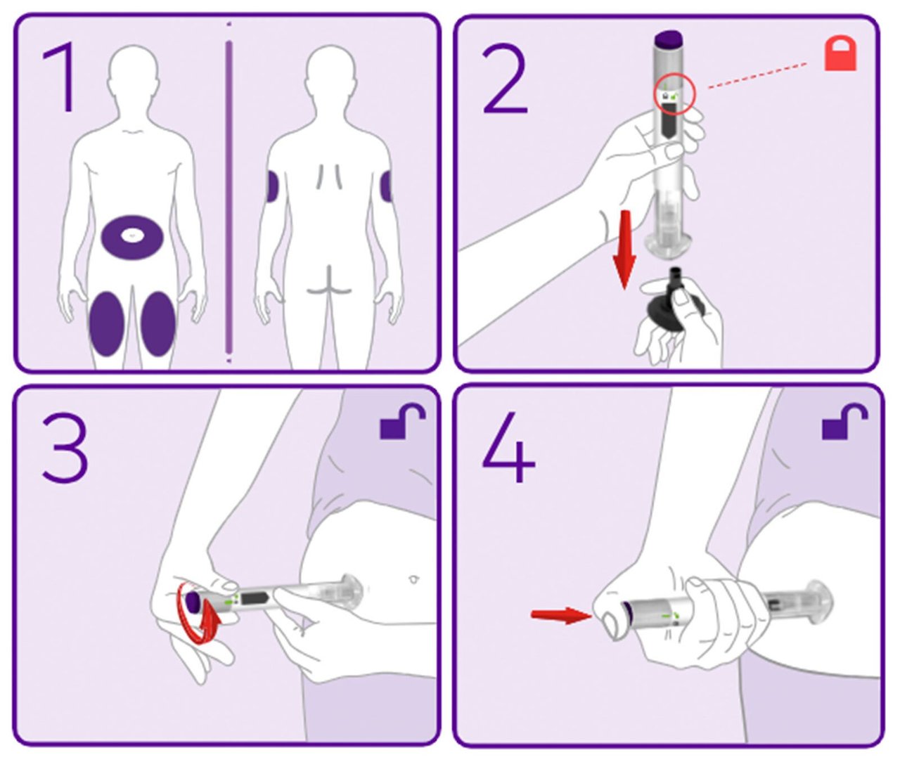 - 복부, 허벅지, 위팔 뒷부분의 피하 지방층에 주사합니다.