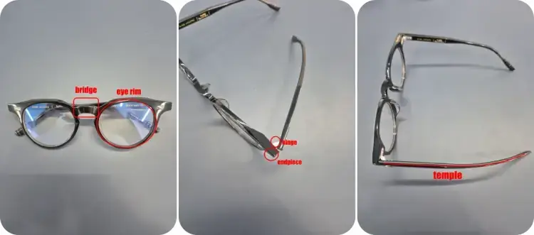 - eye rim : 렌즈를 둘러싸는 부분이자 고정시키는 역할을 합니다. 이곳의 디자인에 따라 사각형, 원형, 다각형으로 나눌 수가 있고 스타일링을 다르게 할 수 있습니다. 온전하게 다 있으면 온 테, 온전하게 있지만 테가 얇아서 홈을 파야하는 경우엔 역산각테, 위나 아래가 없고 나일론 실로 연결되어 있으면 반무테, 테가 아예 없고 나사로 고정해야 하면 무테로 나눠집니다. (림 안쪽에 렌즈의 산막이 들어가는 부분을 Groove(홈)이라고 합니다.)
