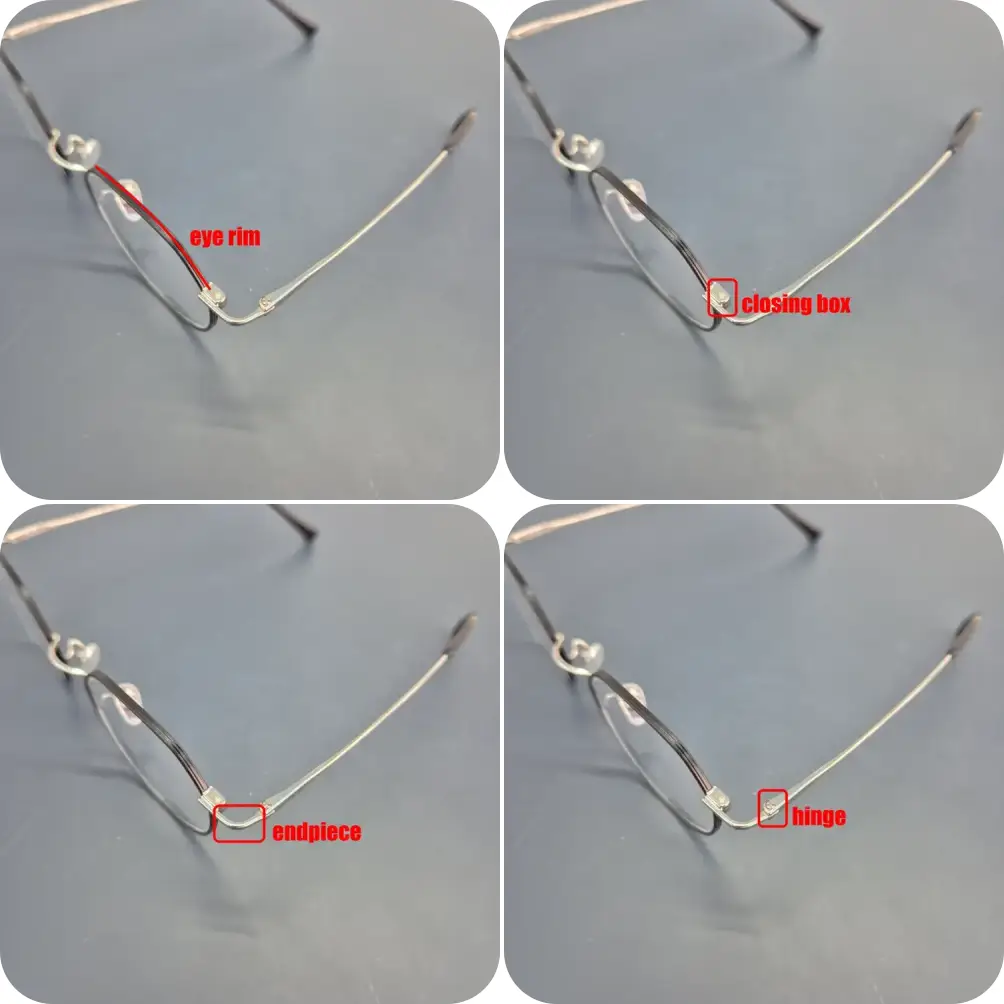 - endpiece : rim과 temple을 연결시켜 주는 부분입니니다. 여기 디자인에 따라 안경테의 느낌이 달라지고 내구성, 편안함이 천차만별입니다. 또한 여기가 짧게 되어있다면 얼굴 큰 사람들은 착용하기 어려울 수 있으며, 약하게 제조가 되면 쉽게 부러지는 곳입니다.