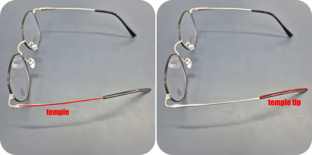 - temple : 전체적인 안경을 제자리에 고정할 수 있도록 착용자의 귀에 걸치게 하는 역할입니다. 예전에는 temple이 없었고, 코 위에, 모자에 걸치게 하거나 손에 들고 착용하곤 했습니다. 현대에 와서 다리가 만들어지면서 귀걸개형, 스포츠형 고글처럼 다리 곧은 형 등이 있습니다. temple의 재질 중 베타티타늄은 유연성도 좋고 알레르기가 없어서 착용감이 매우 좋은 소재로 알려져 있습니다.