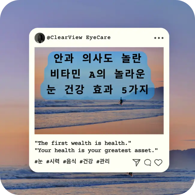 여러분의 눈은 세상을 바라보는 창문입니다. 이 소중한 창문을 비타민 A의 도움을 받아 더욱 건강하게 관리해 보는 것은 어떨까요? 오늘부터 식단에 비타민 A가 풍부한 음식을 조금씩 더해보세요. 그리고 가족과 친구들에게도 이 놀라운 사실을 알려주세요.