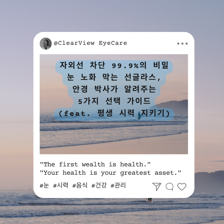 뜨거운 태양 아래, 당신의 눈은 무방비 상태! 자외선은 눈 노화와 안질환의 주범입니다. 10년 차 안경 박사가 당신의 평생 시력을 지켜줄 완벽한 선글라스 선택법 5가지를 공개합니다.